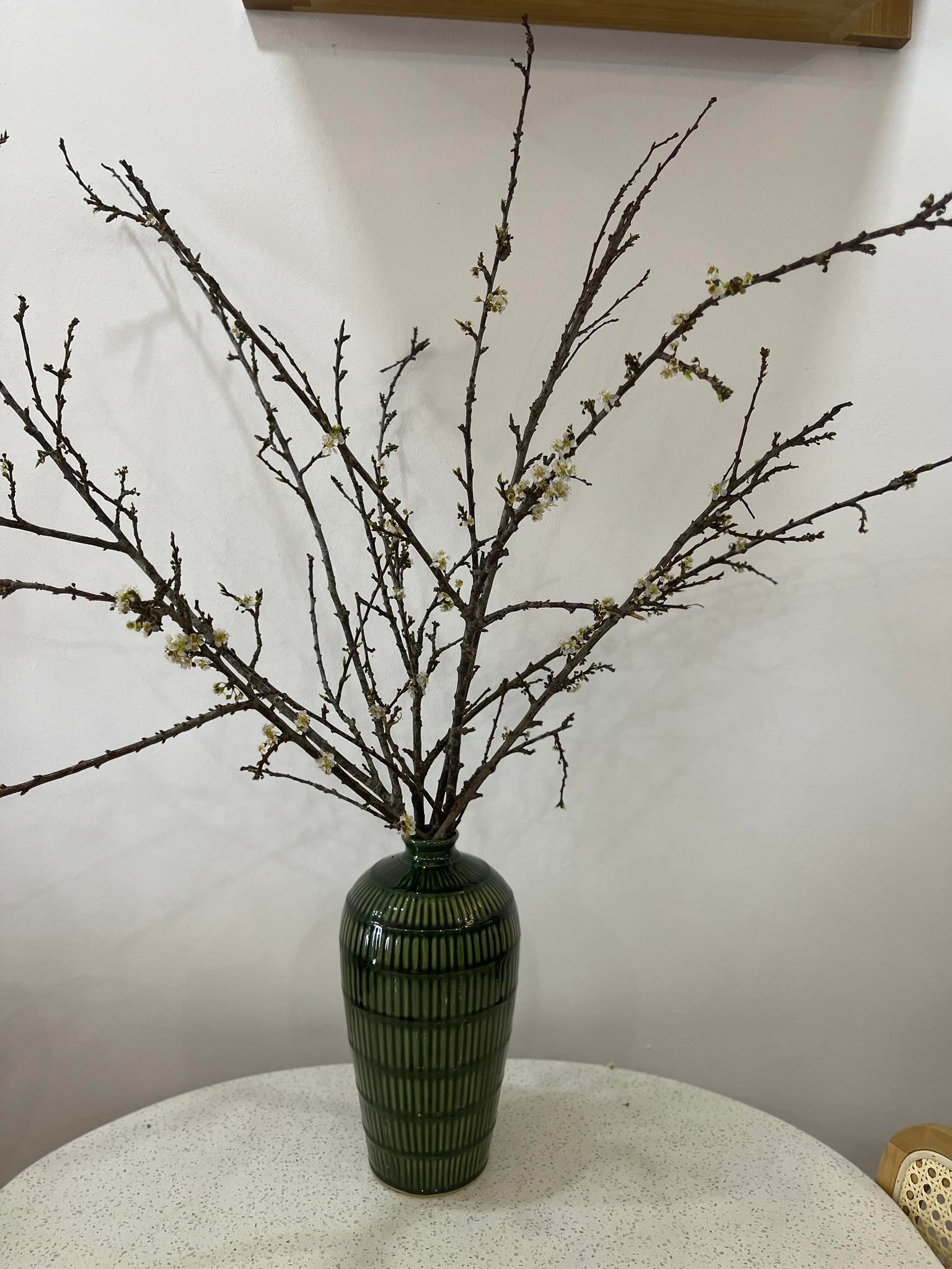 Chọn bình phù hợp: Các loại cành cao nên đi cùng bình gốm mộc, bình dáng cao hoặc bình thủy tinh tối màu để tạo sự cân đối.