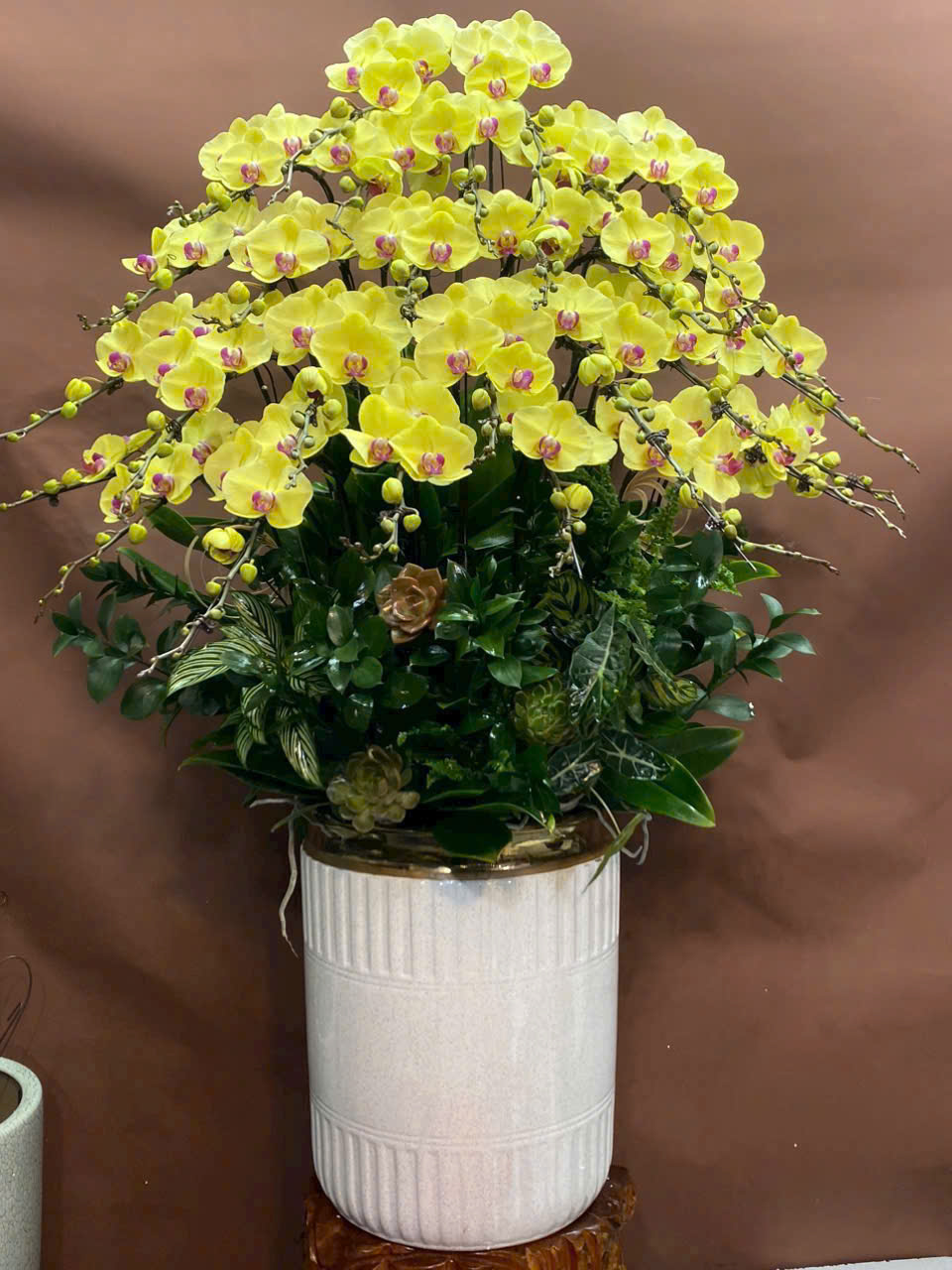 Điểm nhấn: Những bình Lan Hồ Điệp được thiết kế đa tầng, tượng trưng cho sự thăng tiến và bền vững.